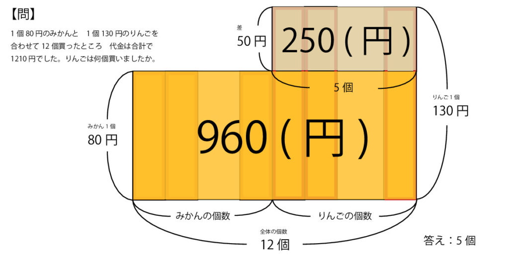 つるかめ算の考え方です。つるかめ算の考え方①~③は前回のブログを見てください!